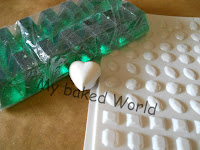 Anfang der Woche habe ich den Herzchen-Silikonstempel und das grüne Isomalt ausprobiert. Dabei konnte ich auch gleich meine Diamanten-Gießform ausprobieren.